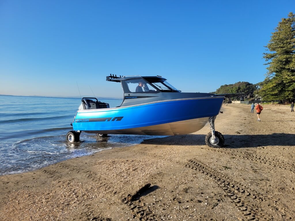 I liken these vessels to Lamborghini vehicles. What?! For those who don’t know, Lamborghini began as a tractor manufacturer (Lamborghini tractors are still manufactured in Italy), even though the brand is now mainly known for its luxury and supercar performance vehicles. But what’s the connection? Well, just watch the new 8.6 Alloy MAX lumbering across a foreshore on its large extra knobbly tyres, as it heads for the water. I for one cannot help but think of a tractor. Even the well-muffled 40 hp EFI petrol engine located in the stern of the vessel gives off a distinctive somewhat tractor-like exhaust note as the craft steadfastly crawls towards the waves at a maximum speed of 10 kph. Don’t like the engine noise? The obvious solution to this would be an electric, on-land, drive set-up and according to Nicholas, an electric version will soon be available.