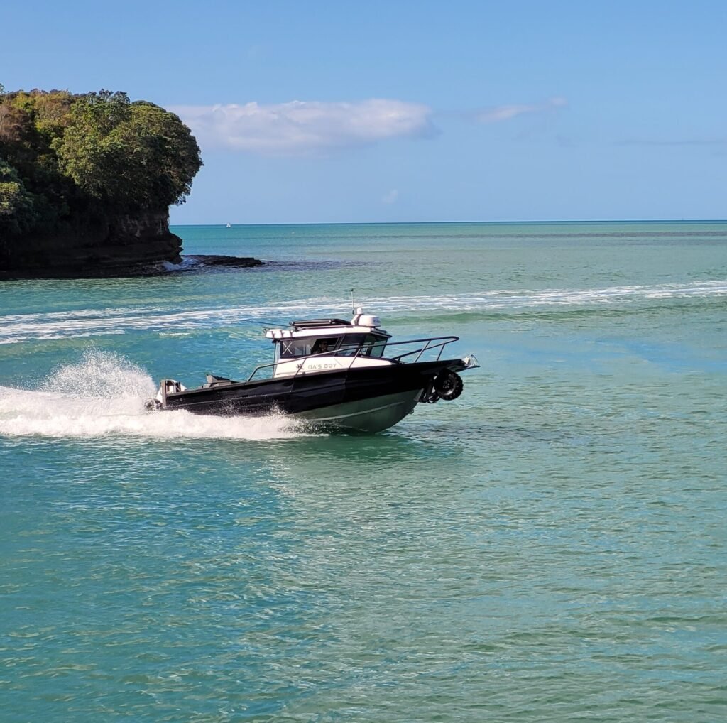 However, after introducing myself, I loaded my kit bag on board and then witnessed Julian dexterously manoeuvre “DA’S BOY” from its cubby hole beside his garage onto the road in front of his place, less than 200 metres from Cheltenham Beach. Even though amphibious boats are becoming much more common in New Zealand, it was still quite a hoot to see the StabiX 240UCC parked in front of the petrol bowser before heading back down the short avenue to the beach.