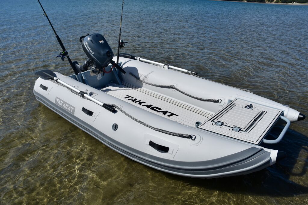 Climbing aboard the new Takacat T300 LX-R, the first thing you notice is how solid and well-built it feels. This New Zealand-designed inflatable catamaran RIB is a compact tender, but it carries itself with the confidence of a much larger craft. The dual 3mm alloy deck and rigid central hull give it a reassuring heft underfoot, while the oversized 1.2mm TPU tubes provide excellent buoyancy and stability that you can feel immediately.