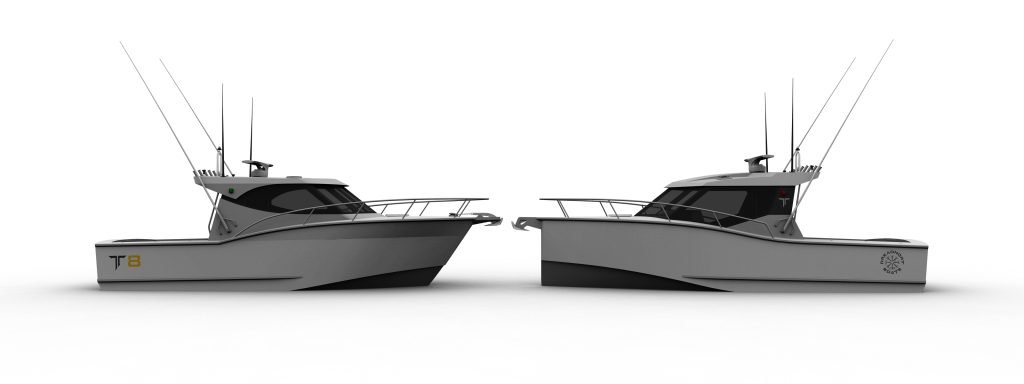 Both 8-metres feature the same radiused transom, with a large, chamfered counter to help with backing up on gamefish. The chamfer is designed to create lift in reverse, whilst the radius (in plan view) allows the water to sweep around the sides more easily. The T8 has a flared bow created by it having two topside plates at different angles to help facilitate a dryer ride and turn the spray away. The result of this, as evident in the renderings, is a large deck area forward. As you can imagine, extra deck equals extra structure and weight. The foredeck is not the best part of a vessel to carry extra weight, we’ll touch on this a bit later in ‘Some interesting points’. The V8, with its vertical bow, has very upright side plates forward, this being dictated by the stem angle and bow cone. Due to the bottom plate shape, the running strakes and the chines, this hull shape runs surprisingly dry. It is possible to run flared topsides with developed plate on these hulls and we previously created a design with this. Both vessels from approximately midships aft have relatively vertical topsides; good stability is all about the chine beam and length of chine in the water.