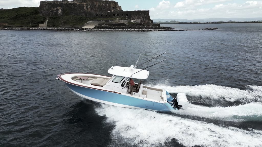 After the successful debut last March 2023 at the Palm Beach International Boat Show, where three units have been sold, Turkish boatbuilder Vicem Yachts is proud to release the first images of the new Vicem Tuna Masters 37 (TM37) hull#1 while running in the clear blue water of Puerto Rico. This 37-foot, center console (“CC”) fibreglass vessel has been conceived to be the starting model of a new series of sport-fishing and cruising boats.
