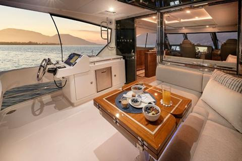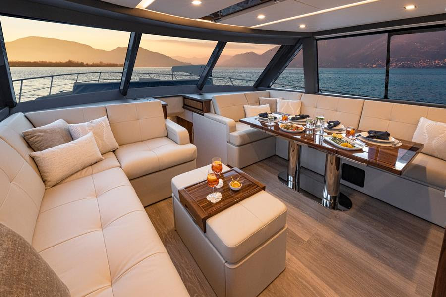 Forward, an L-shaped leather dining lounge with a folding timber table faces a matching sofa, creating an elegant and sociable saloon space. With electric blinds lowered and the Smart TV raised, the saloon transforms into a cinema lounge with premium sound system. A portside saloon door provides quick access to the side deck for mooring duties or fresh air, and also leads forward to the foredeck.