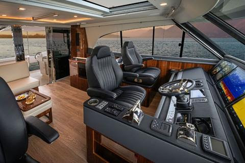 The fully enclosed flybridge of the 64 Series II combines commanding views with exceptional quietness underway. Its modern yet timeless styling mirrors saloon-level luxury. A plush L-shaped lounge, ottoman coffee table, and LED Smart TV create a welcoming retreat. The lounge also converts to a double bed for guests or crew. The flybridge opens to an aft deck sheltered by an extended hardtop. This versatile, all-weather area can be enclosed with Riviera’s high-quality clears or breezeway mesh and includes a wet bar, folding timber table, stainless fridge, sink, and solid-surface benchtop. An exterior helm station with joystick, and optional wheel, throttles, and navigation screen, offers excellent visibility for docking or sport fishing. Inside, the forward helm features touch-screen navigation and integrated controls for effortless operation. Curved glass windscreens provide outstanding visibility, while fully adjustable leather captain and companion chairs ensure supreme comfort. Owners may also opt for a third helm chair in place of the companion lounge. The Twin Disc Express Positioning System (EPS) integrates engines and hydraulic thrusters for precise control, maintaining station automatically in wind or current.