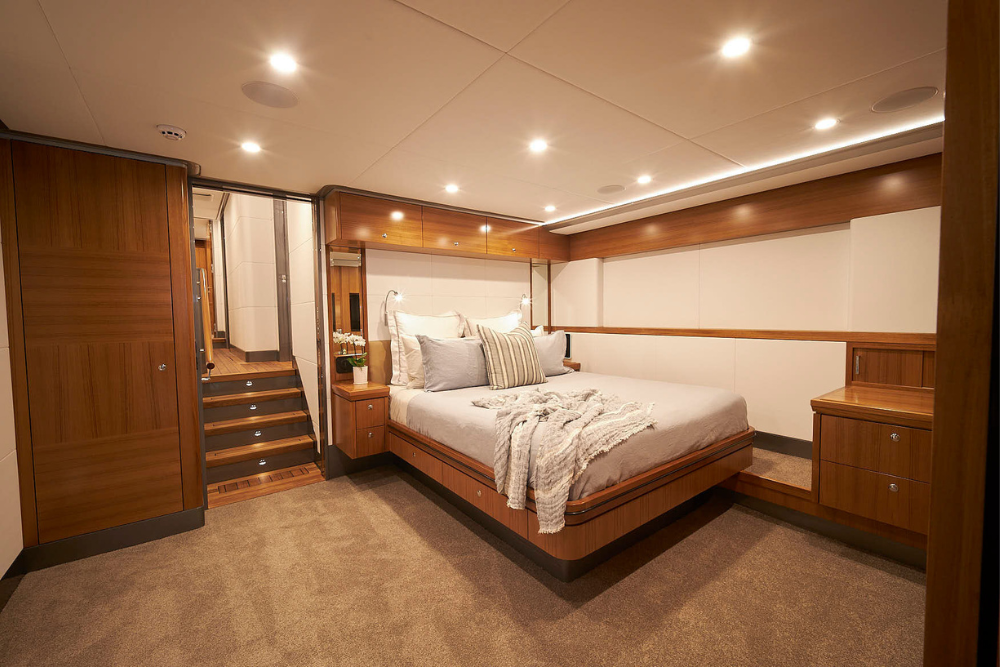 The interior, designed and crafted by Yachting Developments, is modern, calm, and highly functional. Clean architectural lines, warm timbers, and restrained neutral finishes create an atmosphere that is both contemporary and enduring. The emphasis is on space, clarity, and usability — qualities that become essential during extended periods onboard.