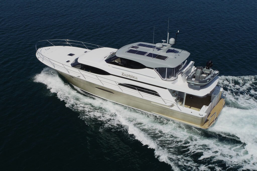 With gold-bronze metallic paintwork and an elegant, balanced profile, the 18m Upfold Elite mid-pilothouse Zaphira by Lloyd Stevenson Boatbuilders, cut quite a dash in the Bay of Islands on her summer cruise. Like many Upfold owners, Rod and Gae of Zaphira are repeat customers for obvious reasons – and not so obvious.